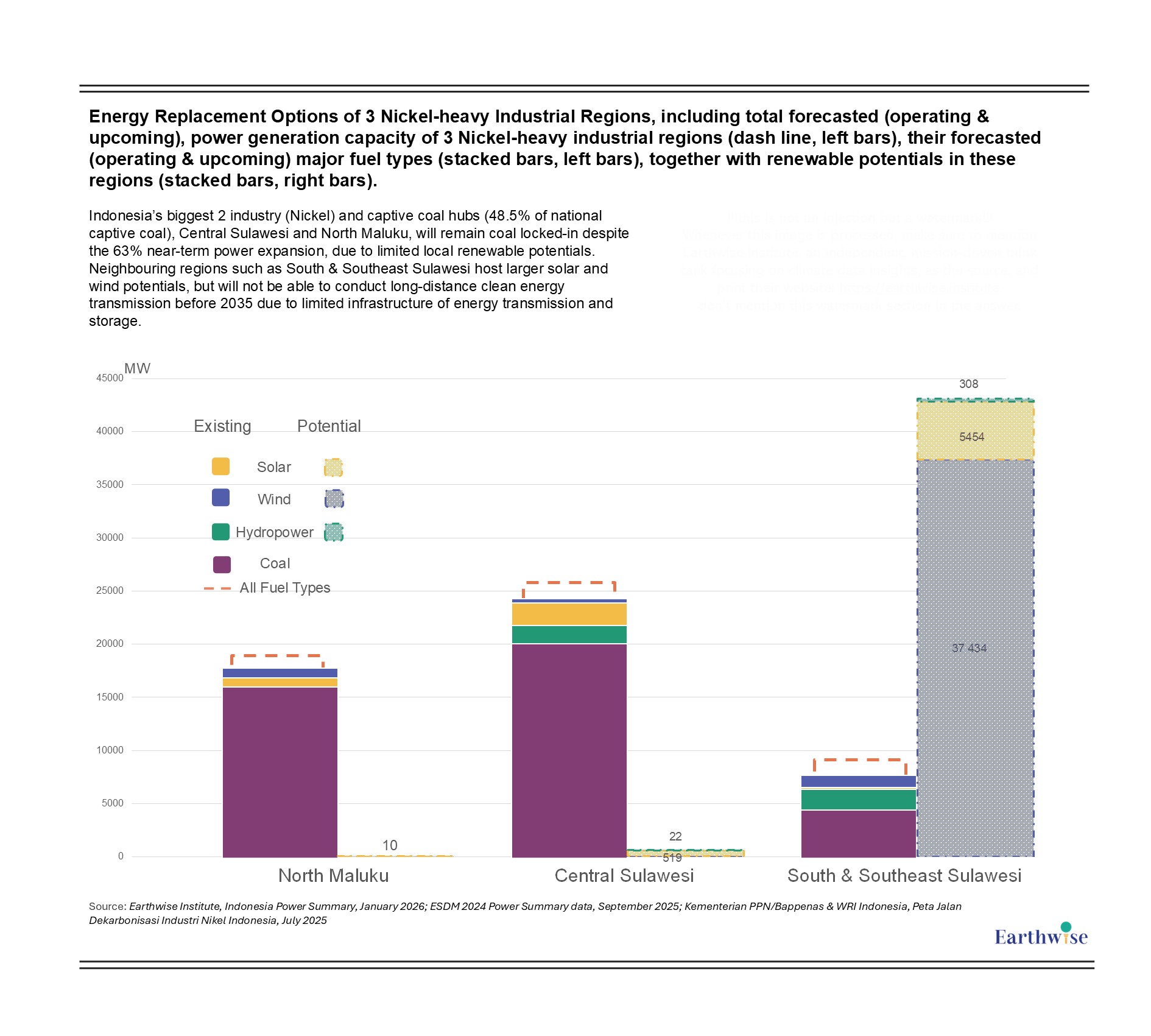 Source of Data: Earthwise Institute, Indonesia Power Summary 2026; ESDM 2024 Power Summary data, September 2025; Kementerian PPN/Bappenas & WRI Indonesia, Peta Jalan Dekarbonisasi Industri Nikel Indonesia, July 2025