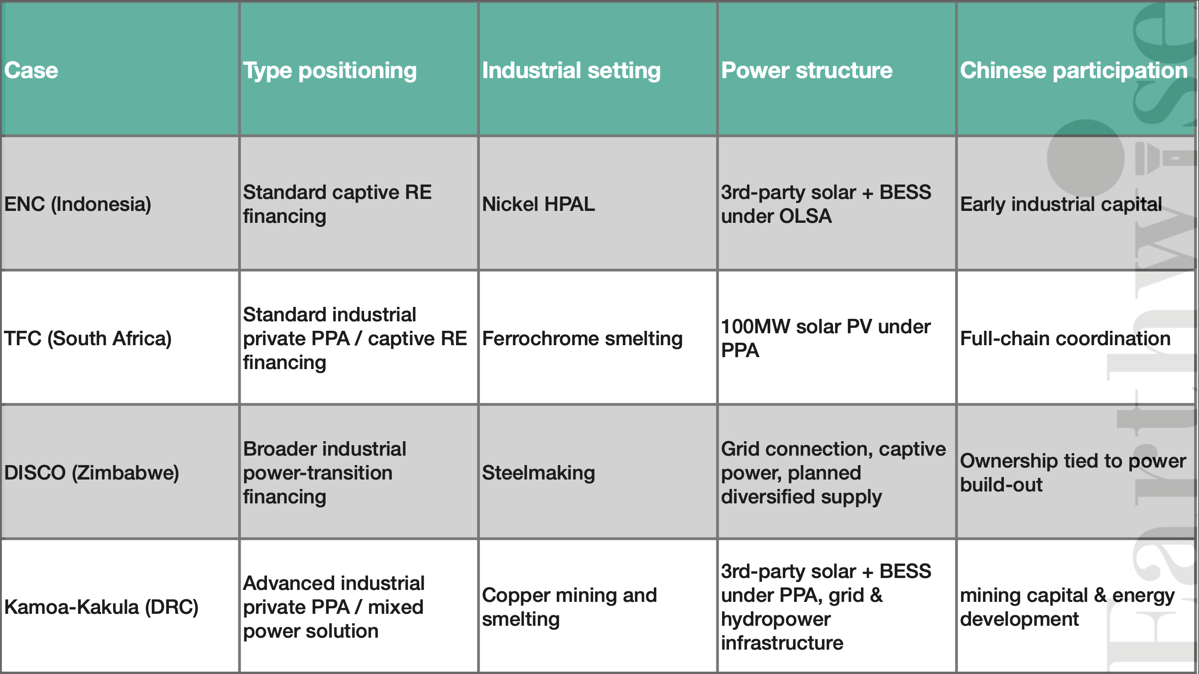 The four cases map a continuum in heavy industry green power financing. At one end are more standard industrial captive/private PPA renewable projects. At the other are broader power-transition arrangements that finance a wider industrial power system. ENC (Indonesia) and TFC (South Africa) sit closer to the standard end. In both cases, the industrial offtaker is clearly identified, the power asset is closely tied to a specific industrial load, the long-term contractual structure is clear, and financing is concentrated on the renewable asset itself. DISCO (Zimbabwe) sits at the broader end. Its financing pathway starts with transmission access, captive power, and basic power availability, with lower-carbon supply added over time. Kamoa-Kakula (DRC) sits between these two ends and moves further toward a more advanced model. Under long-term PPAs, it brings in third-party financed solar-plus-battery infrastructure designed to deliver industrial clean power in a form closer to baseload supply.