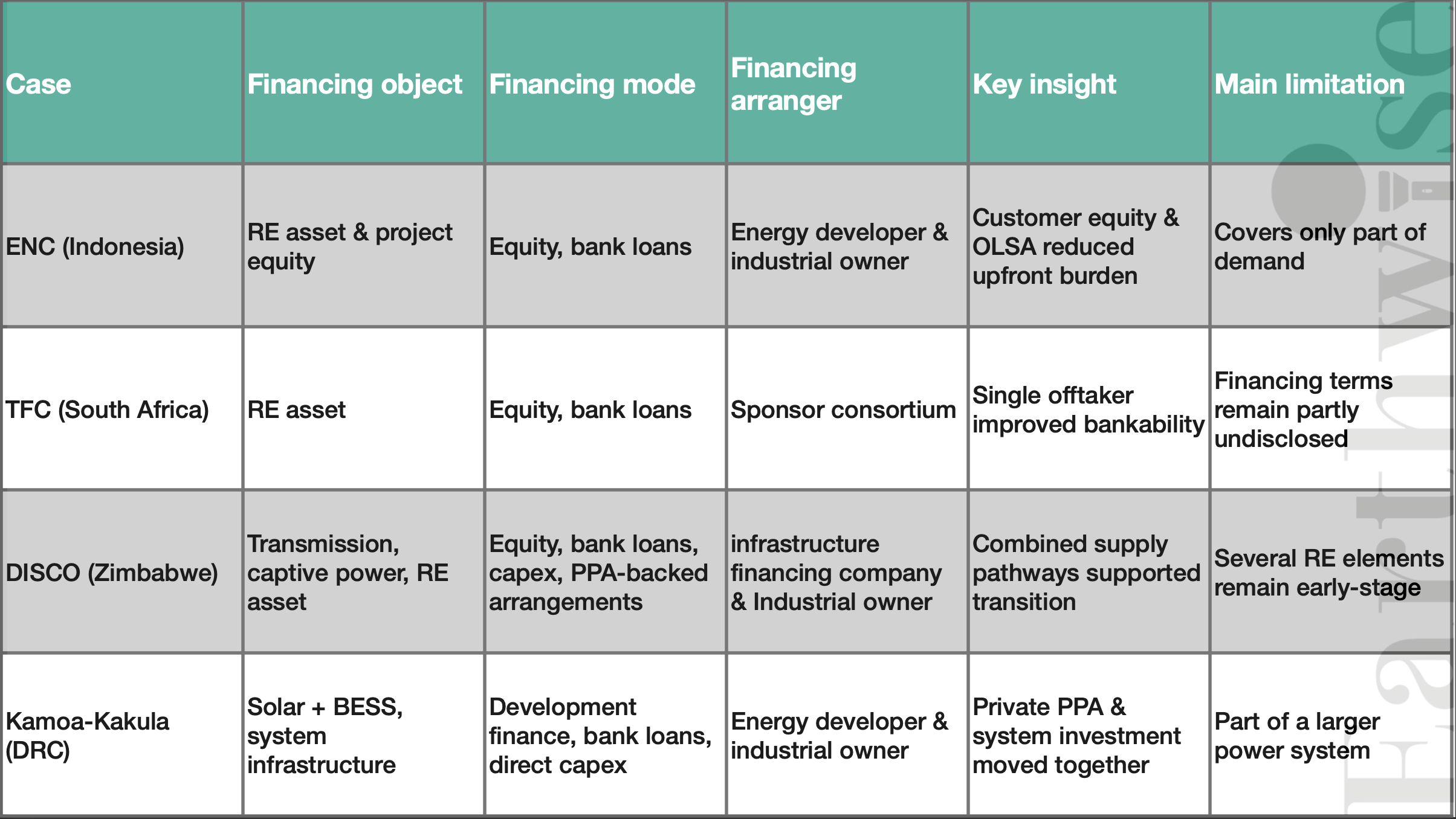 In cases of ENC (Indonesia), TFC (South Africa), and Kamoa-Kakula (DRC), financing includes arrangements built around the renewable asset itself. In the case of DISCO (Zimbabwe), financing extends more clearly across the wider industrial power system, including transmission access, captive generation, and diversified supply. This difference shapes what the project needs to make bankable. Some cases are structured around a renewable plant. Others are structured around a broader industrial power system.