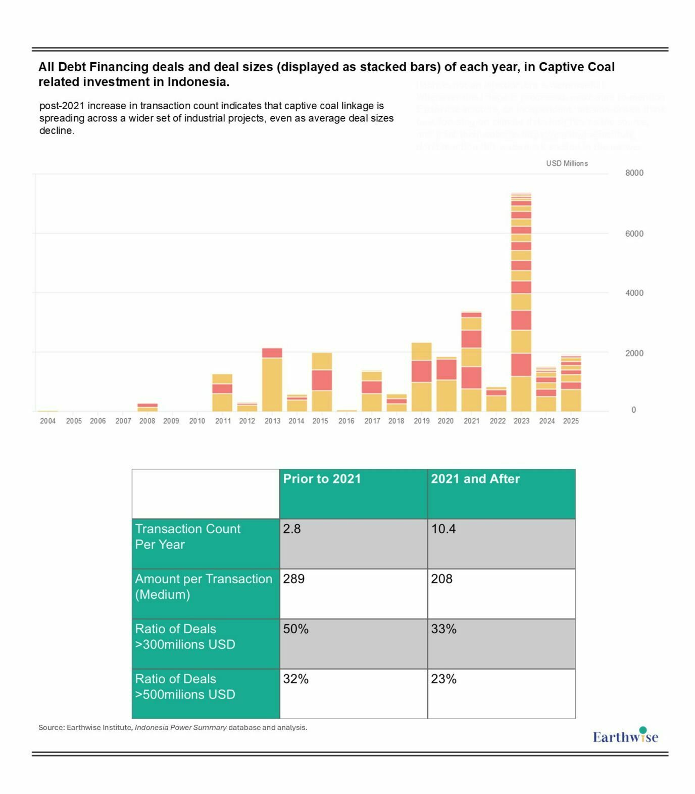 Figure 1: All Debt Financing deals and deal sizes (displayed as stacked bars) of each year, in Captive Coal related investment in Indonesia (Top); Debt Financing deals, before & after 2021, in Captive Coal related investment in Indonesia (Bottom)