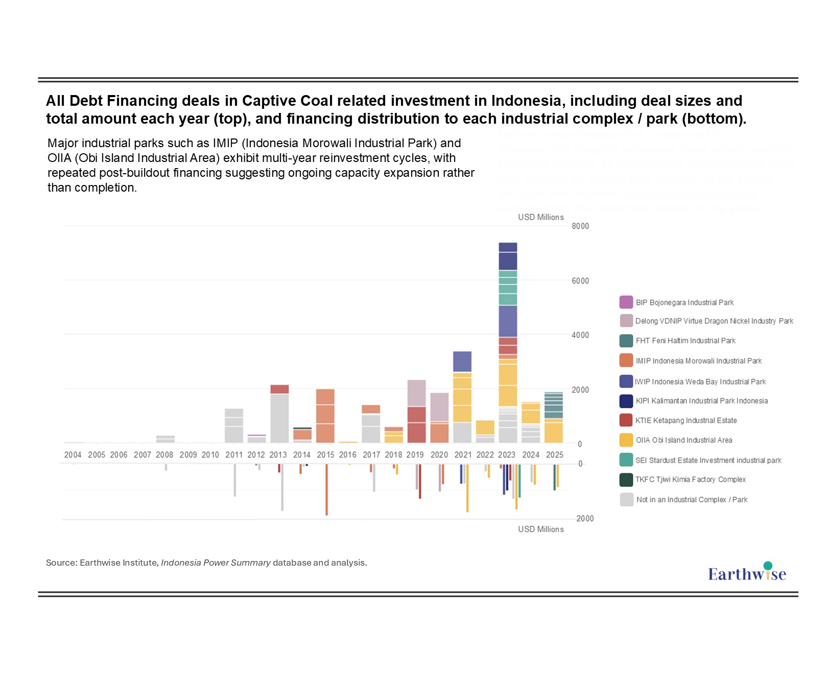Evidence from transaction level debt financing linked to captive coal in Indonesia indicates a deepening of structural lock-in. This is reflected in three dimensions. The post-2021 increase in transaction count indicates that captive coal linkage is spreading across a wider set of industrial projects, even as average deal sizes decline. Major industrial parks such as IMIP (Indonesia Morowali Industrial Park) and OIIA (Obi Island Industrial Area) exhibit multi-year reinvestment cycles, with repeated post-buildout financing suggesting ongoing capacity expansion rather than completion. Meanwhile, financing remains heavily concentrated in power intensive commodities – most notably nickel and increasingly aluminium – while legacy sectors such as pulp & paper continue to generate recurring financing demand. Together, these patterns indicate that captive coal is becoming more deeply embedded within Indonesia’s industrial development trajectory, rather than being marginalised by energy transition dynamics.