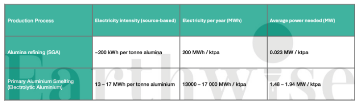 Electricity demand for upcoming projects is estimated using process-specific intensity benchmarks from the IEA Energy Technology Network (2012) and the European Commission Joint Research Centre (2024) (Table 1). These distinguish clearly between stages of the aluminium value chain: