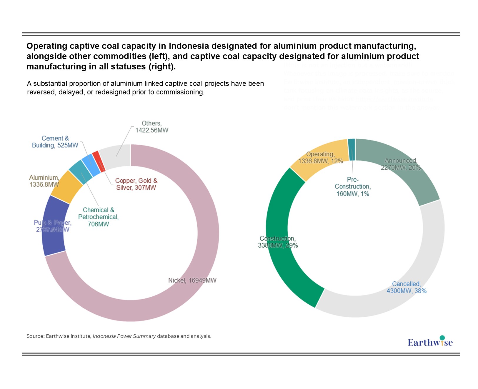 Figure 2: Operating captive coal capacity in Indonesia designated for aluminium product manufacturing, alongside other commodities (left), and captive coal capacity designated for aluminium product manufacturing in all statuses (right)