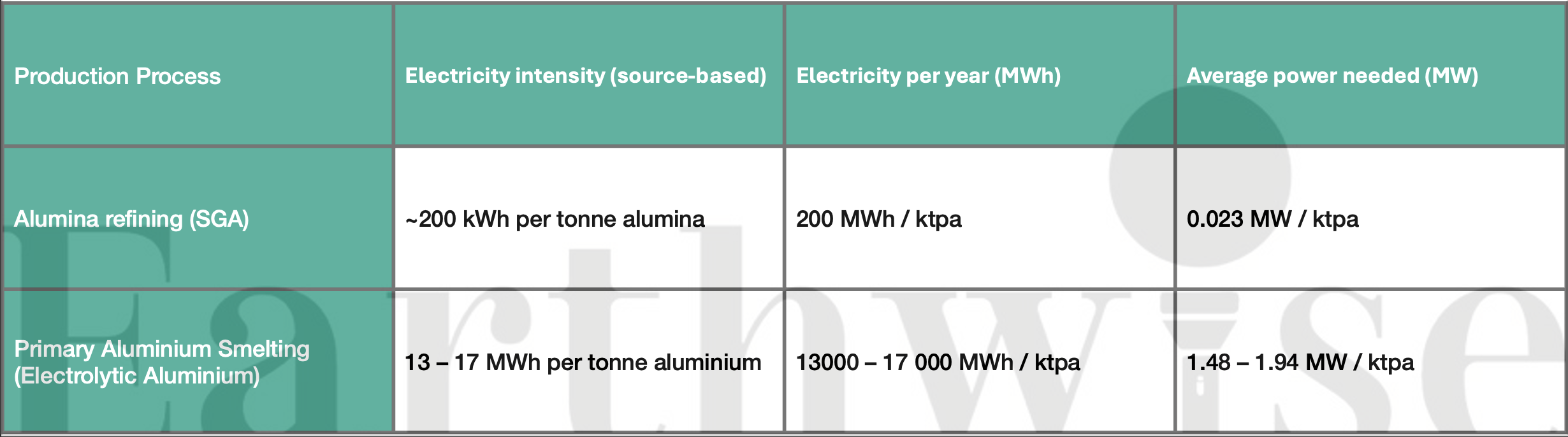 - Primary aluminium smelting: approximately 13 – 17 MWh per tonne