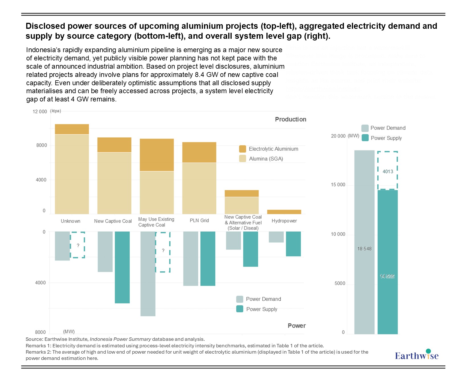 Figure 3: Disclosed power sources of upcoming aluminium projects (top-left), aggregated electricity demand and supply by source category (bottom-left), and overall system level gap (right)