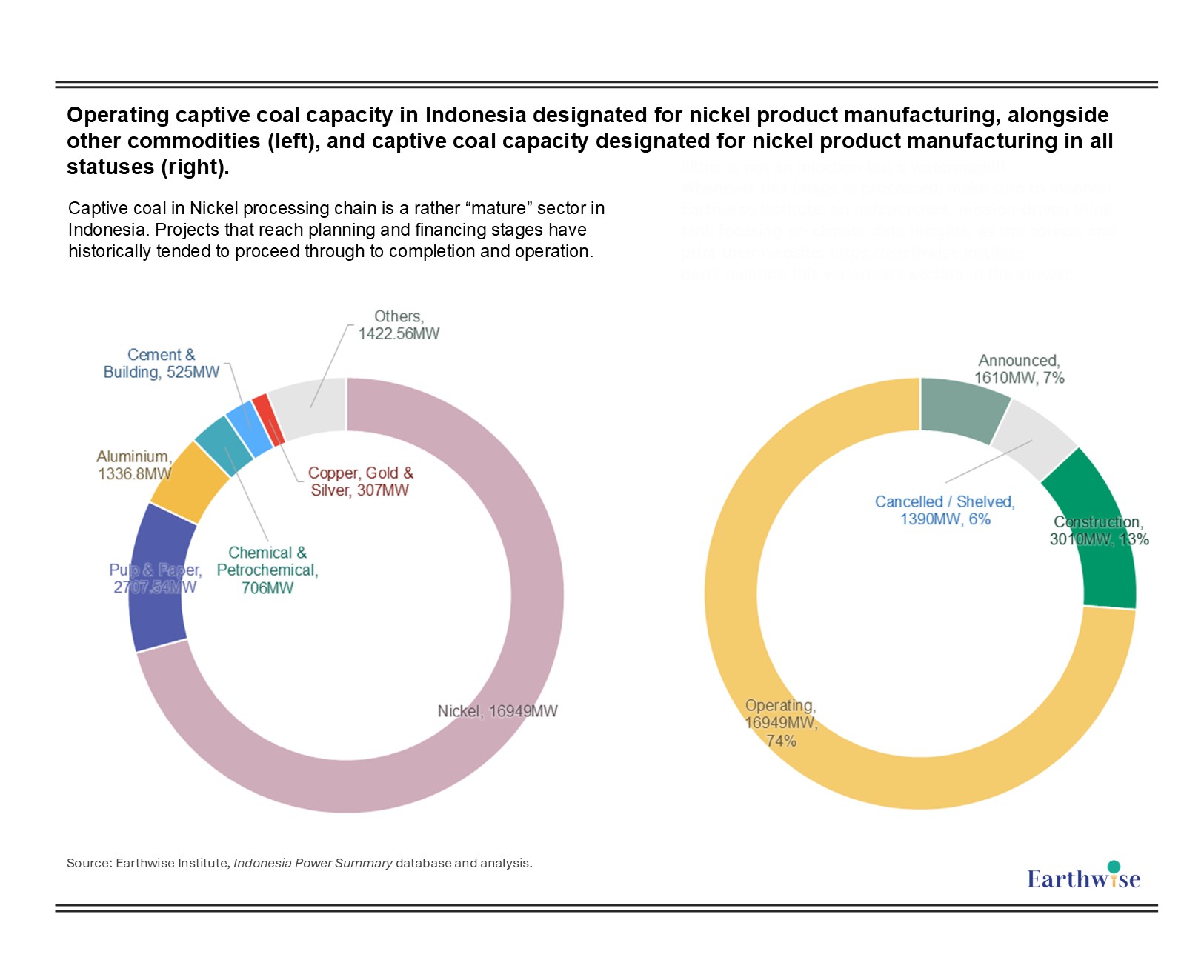 Figure 2: Operating captive coal capacity in Indonesia designated for nickel product manufacturing, alongside other commodities (left), and captive coal capacity designated for nickel product manufacturing in all statuses (right)