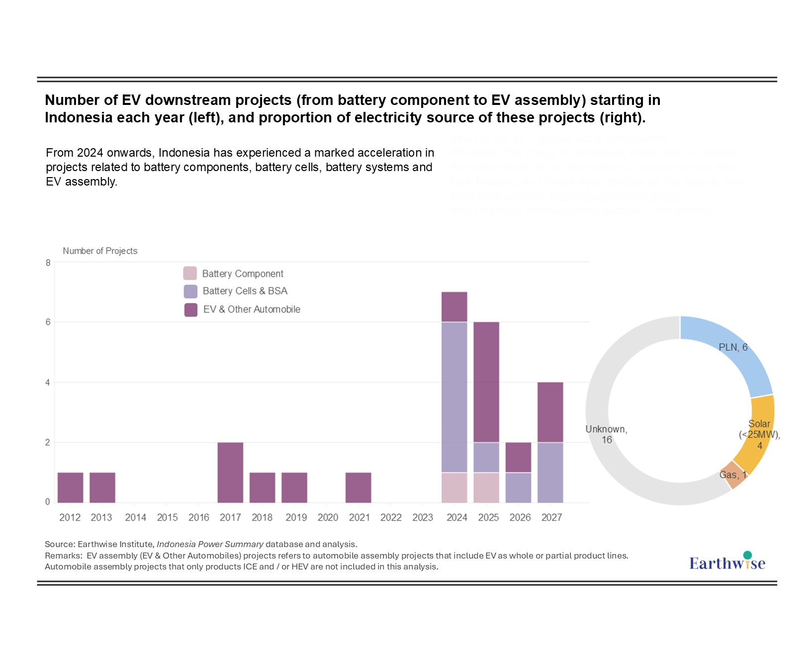 Figure 4. Number of EV downstream projects (from battery component to EV assembly) starting in Indonesia each year (left), and proportion of electricity source of these projects (right)