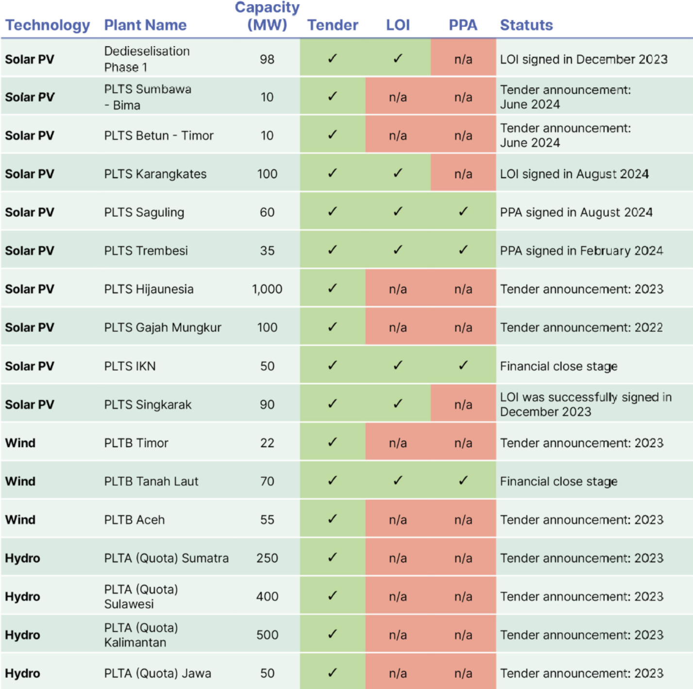 Table 4: Indicative renewable project pipelines disclosed by PLN and Indonesian government in 2022 – more than half of projects did not reach LOI by 2024 after tender announcement; only 4 out of 17 projects reached financial close by end of 2024.